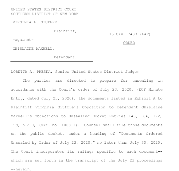 Luckily, U.S. District Judge Loretta Preska, who had jurisdiction to rule over a cache of important Epstein documents, has ordered them to be unsealed by Thursday, July 30th, according to Law and Crime.